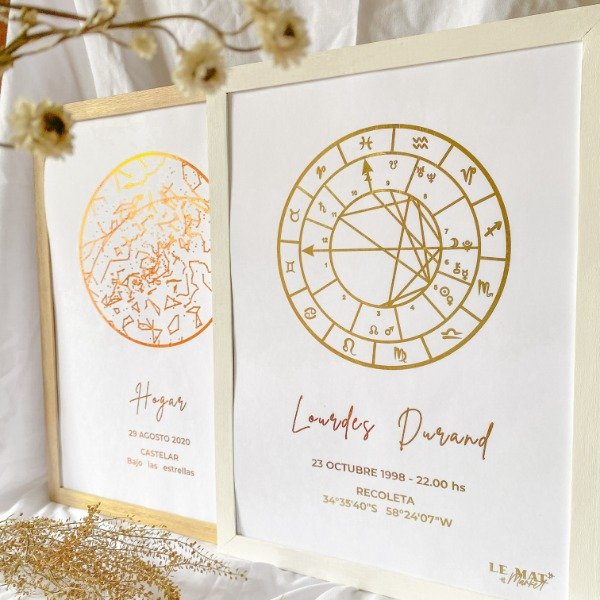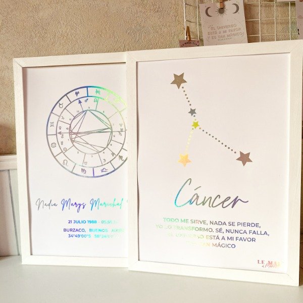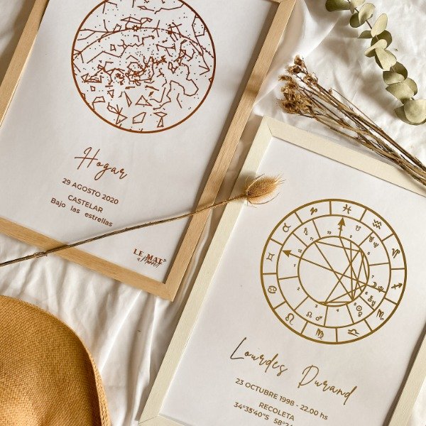 Podés elegir entre diversos modelos: cartas natales personalizadas, mapas estelares, fases lunares, frases inspiradoras y otros diseños creados para acompañarte en tus espacios con belleza y significado.
